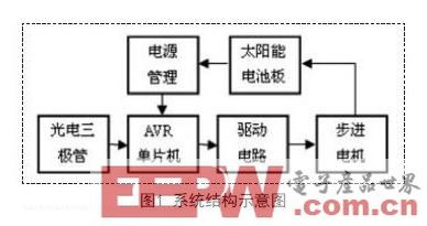 设计采用光强比较法来跟踪太阳光源。整机装置包括:太阳能电池板、电源管理电路、光电管、单片机、电机驱动电路、步进电机以及机械转动平台。系统结构如图1所示。