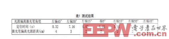 测试条件:光源距离激光笔105cm,激光笔安装在电池板的中心,Y方向上,激光笔在偏离光源±30°范围内。测试结果如表1所示。
