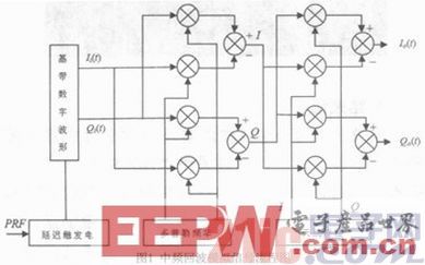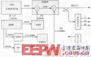 雷达模拟器主要完成雷达波形与距离、多普勒频率、天线方向图的调制,由于雷达波形采用了基于DDWS(直接数字波形合成)的任意波形产生技术,所有雷达激励波形的采样信息存储在波形存储器中,通过寻址不同的存储空间,并将存储数据送入到数模转换器(DAC),从而完成雷达激励波形的重构。多普勒调制采用了文献的数字IQ调制器技术实现,如图1中的多普勒调制部分。在本频率合成器设计中,频率合成器实时接收雷达天线方位、俯仰角,解算出天线指向角与目标问的角误差,并对和差通道进行方向图的幅度相位调制,当天线指向角与航迹角相等时,角误差为0,雷达精确地跟踪上目标;当角误差超过雷达的波束宽度,判为目标丢失,关闭信号输出,直至雷达重新截获目标。完整中频回波模拟(激励器)信号流程如图1所示(仅和差三通道中的一路)。