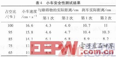 结果表明,当小车以最大速度行驶,面对前方障碍物的情况下,小车仍可安全制动,且未与障碍物发生碰撞,从而验证了本设计的安全性。结果如表4所示。