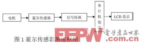 霍尔开关元件内含稳压电路、霍尔电势发生器、放大器、施密特触发器和输出电路。输出电平与TTL 电平兼容,在电机转轴上装一个圆盘,圆盘上装若干对小磁钢,小磁钢越多,分辨率越高,霍尔开关固定在小磁钢附近,当电机转动时,每当一个小磁钢转过霍尔开关,霍尔开关便输出一个脉冲,计算出单位时间的脉冲数,即可确定旋转体的转速。其系统框图如图1 所示。