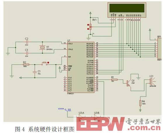 用霍尔传感器测量转速,其检测到的信号为一个个的脉冲,所以不需要进行模数转换,信号经传感器后,滤去杂波即可直接接入单片机进行计数处理。由于是数字脉冲信号,所以滤波的时候采用两次反向操作,即可达到隔离整形的目的。硬件搭接如图3 所示。其中74LS14 为六位反相器。