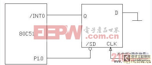 从图可以看出,外部中断0请求信号在D触发器(可选用74LS74)的时钟输入端。当外部设备有中断请求信号(为低电平)出现时,Q端输出为低电平,/INT0有效,向CPU发出中断请求信号。CPU响应中断后,在中断服务程序中由软件安排1个低电平中断应答信号,从P1.0送至D触发器的/SD(置位端,低电平有效),使D触发器的Q端输出为高电平,从而撤除了低电平的外中断0请求信号。/SD端所需的低电平可通过在中断服务程序中增加一下指令的得到: