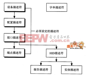 在图1的描述符中,设备描述符(device descriptor)、配置描述符(configurationdescriptor)、接口描述符(interface descriptor)以及端点描述符(endpoint descriptor)是必须具有的。而其他的描述符,如字符串描述符(strtng descriptor)、 数种不同的群组描述符(class descriptor)以及报告描述符(report descriptor)则可以根据不同的设备加以添加或删减。