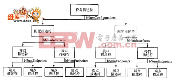 各种描述符可以用如图2所示的描述符层来作更深动的叙述。最上层的层是设各描述符。在设各描述符的bNumConfigurations 字段中,设置一个或多个下一层的配置描述符。在配置描述符的bNumlnterface字段中,设置一个或多个下一层的接口描述符。最后 在接口描述符的bNumEndpoints字段中,则设置最后一层的端点描述符。