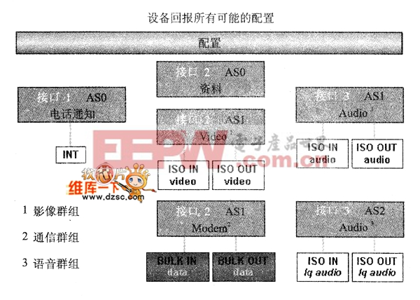 当此设备在执行设各列举的程序时,主机会读取设各描述符,并且决定何种配置被使能。但每一次仅能有一个配置被使能。例如, 有一个设各可能具备高功率总线供电的配置,以及另一个是自我供电的配置方式·如果当此设各被接上具有主要的电源供应的主机后 ,设各驱动程序可以选择来使能这个高功率总线供电的设各。而此配置即可进一步地去使能此设各无须再连接至主要的电源供应器, 就可以获得电源。但是,如果此设各被连接至台式计算机,它也可被使能一种需要用户去接上电源供应点的第二种配置方式(自我供 电模式)。在这配置描述符中,不仅只限于设置电源的差异。每一种配置方式能够以同样的方式供电,以及流出相同的电流量,当然 也可具各不同的接口或端点的组合。然而,需注意的是,更改配置将会使在所有端点上的动作停止。虽然USB提供了这种便利性,可 是很少有设各具有超过一种配置。但对于如图3所举的复合式设各的例子就具有多种配置方式。
