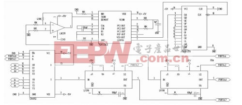 被测中频电源的输出电压经过变压器后滤去高频谐波送入 CD4052 准备采集,输出电流经过互感器后滤去干扰信号,再经过精密采样电阻转换为电压信号送入 CD4052 准备采集。三相电压信号和电流信号经过 CD4052 后送入两片采样保持器 LF398,CD4052 集成芯片的双路选择结构能够确保输出同相的电压信号和电流信号,其通道地址由 PORTA.0 和PORTA.1 给出。两片采样保持器 LF398 的逻辑控制信号同时由 PORTD.2 给出,确保能够采集到同一时刻的电压信号和电流信号。LF398 的输出信号由 PORTA.6、 PORTD.7 输入单片机,由采集程序完成数据采集。频率测量是通过将 CD4052 输出的单相电压信号经电压比较器 LM339 转变为方波信号,由锁相器74HC4046 进行频率跟踪,再用分频器 74HC4020 分频后输入单片机的 PORTD.6,利用单片机的输入捕获功能测量频率。