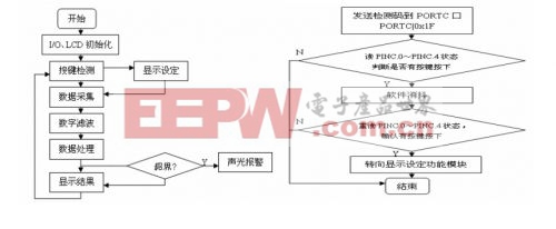主流程和按键检测子程序流程如上图所示。按键检测主要用于显示切换,PORTC.0~PORTC.4 分别对应于显示设定为 U 相、V 相、W 相或平均值
