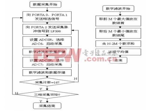 数据采集和滤波子程序流程如上图所示。方法为每次等时间间隔采集 16 次,经过数字滤波后依次存入采集结果单元。