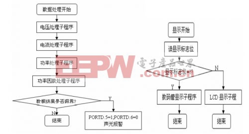 数据处理和显示控制子程序流程如上图所示。数据处理子程序主要将采集数据转换为显示 BCD 数据存入显示单元,并对过欠压、过流、低频等作出判断。显示子程序包括数码管动态显示和 LCD 显示两大模块,其显示方式由按键处理子程序控制。由于篇幅关系,本文就不再