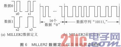 EPC GEN2协议中规定标签反向散射的数据应该采用FM0或者MILLER的编码方式。MILLER定义在两个数据“0”之间变换相位,在数据“1”中间放置一个相转化,MILLER2码则表示每一位数据重复两个副载波周期。完整的MILLER2编码,需要在有效数据前加上前同步码。前同步码可编程选择格式,在Query命令中将M和Trext这两位设置为1,选择前同步码由16个数据“0”加上数据序列“101112”构成。MILLER2数据定义和前同步码如图6所示。MILLER2码每一位数据的时间长度由Tari值决定,本设计中为2个Tari(即1 2.8μs)。