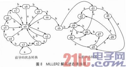 以上状态中,当状态机当前状态为d2、d3、d6、d7、d8、d9的一种时,表示收到1位有效数据。状态转换图如图8所示,状态d2、d7只画出了有效输入时的转换图,在无效输入时结束状态机程序返回。