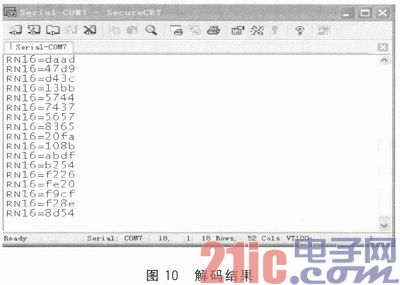 在主函数里面循环发送Query命令并进行MILLER2解码,如果解码成功则使用串口工具在上位机上打印出解调出来的RN16的值,解码失败则不打印。在PC上使用串口工具SecureCRT观察到以十六进制输出的RN16,如图10所示,表明MILLER2解码成功。