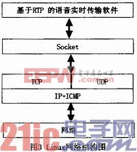 基于RTP协议的语音实时网络传输软件,位于Linux网络结构的Socket应用层,如图3所示。在嵌入式Linux平台上利用Socket系统函数实现语音传输的RTP应用。在具体编程时,Linux平台上可供选用的语言有C、C++等。在这里我们也采用C语言,并采用编译器Arm-Linux-Gcc。