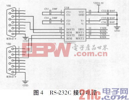S3C2440 本身自带三路独立的UART 接口,在设计嵌入式串口服务器系统时,应用了S3C2440 串口模块的两路UART 接口,另外一路UART 接口做开发时的打印控制台用。这两路串行口用三线通信,采用MAX3232 作为电平转换芯片,分别配置处理器的GPH2、CPH3、CPH4 和CPG5,4 个GPIO 口为TXD0、RXD0、TXD1 和RXD1 串口收发信号线。RS-232C 接口电路如图4 所示。