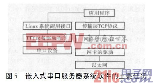 系统软件的设计目标: 嵌入式串口服务器能够接收来自以太网的数据流,将以太网数据流转换为串行口数据流发送给指定串口; 实现串口数据流到以太网数据流的逆过程。软件平台采用拥有完备TCP /IP 协议栈和丰富源码资源的Linux作为串口服务器的操作系统,在ARM9 上移植并裁剪Linux 系统,同时移植完善根文件系统,为应用层软件开发提供平台。应用程序软件的主要任务如图5 所示,通过Linux 系统调用接口、调用串口函数读取数据,并将数据通过socket 接口发往以太网口; 接收socket 端数据、调用串口设备函数,将数据发往指定串口。