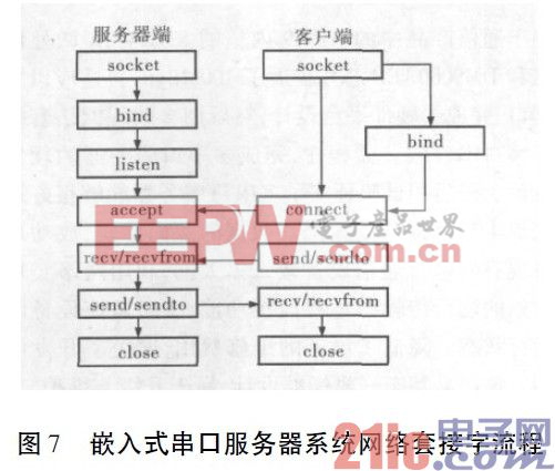 嵌入式串口服务器系统网络套接字编程步骤如图7 所示。