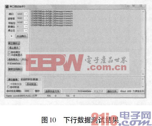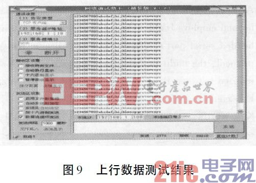 测试方法为每秒钟连续不断地发送“1234567890abcdefghijklmnopqrstuvwsyz”,使之构成100KByte 的数据包,观察客户端程序能否正常收到这个数据包。试验测试结果如图9 所示,当从“终端串口设备”向上位机发送100KByte 数据时,在客户端一侧正常收到了这些数据,并且没有丢失现象。