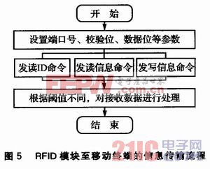 RFID模块通过串口将信息传输至移动终端,信息传输流程如图5所示。当接收缓冲区内字节个数达到或者超过该值后就取出数据并对相应事件进行处理。程序设计的主要任务是:读出标签ID信息(读ID命令);向标签写入存放在数据库中的数据信息(写信息);读取标签中写入的数据信息,查询数据库以得到具体的产品信息(读信息);实时显示读标签信息的结果。