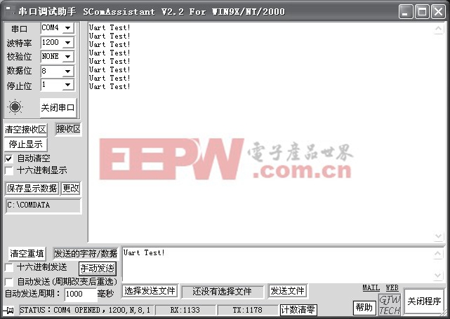 接好硬件,通过冷启动方式将程序所生成的。hex文件下载到单片机运行后,打开串口调试助手软件,设置好波特率1200,复位单片机,然后在通过串口调试助手往单片机发送数据(见图3),可以观察到在接收窗口有发送的数据显示,此外电路板上的串行通信指示灯也会闪烁,P0 口所接到LED 灯会闪烁所接收到的数据。