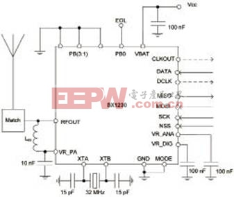 Semtech 公司的SX1230 是窄带/宽带315 MHz、434 MHz 868 MHz和915 MHz ISM频段发送器,可编程输出功率从+17 dBm 到 -18 dBm,比特速率高达600kbps,FSK、GFSK、MSK、GMSK 和OOK调制,单独使用时不需要主MCU,在1.8V~3.7V时有恒定的RF性能,低相位噪音(50kHz时为-95 dBc/Hz),主要用在无钥匙进入(RKE)系统,遥控和安全系统,语音和数据通信链接,生产过程和建筑物/家庭控制,有源RFID,AMR/AMI平台。