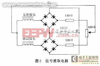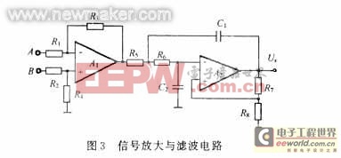 信号提取与处理电路如图2和图3所示。信号提取电路主要有涡流传感器、整流桥和采样电阻三部分。传感器采用阻流圈式传感器,一共有2只。在测量时1只作为基准探头,另1只作为测试探头。在测量前,首先在无应力构件上进行校准,即将两个传感器都放在与被测构件的材料相同性质的无应力构件上,调节WB使桥路平衡,这时AB两端的电压为零。当把测试探头移至被测构件时,由于被测构件受到应力作用,被测构件内部的磁特性发生变化,使得测试探头的涡流阻抗发生变化,因而桥路失衡,桥路不平衡电流流过100 Ω采样电阻并产生压降,这就是要提取的信号。由于桥路输出的是浮地信号,因而会含有较大的共模干扰电压。这将给有用信号的提取带来较大的困难,因此在信号提取电路之后加一级信号处理电路。信号处理电路由一级高共模输入差动放大电路和一级两阶有源低通滤波器组成。对于高共模输入差动放大电路,要求其共模输入电压在±20 V范围内,共模抑制比为85 dB以上,这样就可以有效地抑制共摸干扰信号。然而,为了提高共模抑制比,选配电阻既麻烦又困难。为此,在高共摸输入差放后再接一级二阶电源低通滤波器。可使输出信号中的干扰小于1 mV,从而大大提高了测量精度。