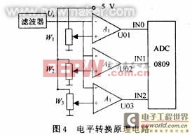 ① 电平转移及A/D变换由于滤波器输出的是大的动态范围和双极性的电压信号,而采用的A/D转换器的芯片是ADC0809,它在+5 V的单电源下工作,其模拟输入电压范围是0~5 V。为了提高测量精度,同时又要满足ADC0809对模拟输入的要求,为此我们对滤波器输出的电压作如下的处理:电平变换和并行多级放大。图4是该部分的原理图。当滤波器输出为零时,调整节Wl~W3。使输入到0809的IN0,IN1,IN2上的电压为+2.5 V。这样,当Us有正负输出时,A1,A2,A3的输出就会在+2.5V的电平上下变动,其范围是0~5V,满足了A/D转换芯片的要求。