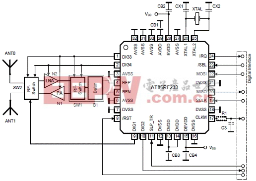 图3.AT86RF233扩展特性应用电路图