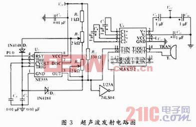 超声波发射电路在测距时通过方波发生器产生脉冲信号,从而激发压电换能器发射超声波。为了提高超声波的发送能力,让其可以传输更远的距离,需要对信号电压进行放大。本文选择NE555芯片搭建超声波发射电路,用MAX232对电路进行升压,只需要+5 V电源供电。因此,超声波发射电路主要包括方波发生器和升压电路,如图3所示。