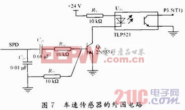 车速传感器的外围电路如图7所示。由于系统所需的供电电源为5 V,而车速传感器需要有24 V的电源接入,因此车速传感器与主控芯片中间需要通过光电耦合器TLP521-1。
