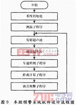 软件系统设计采用C语言编程。软件系统主要包括主程序、定时中断程序、外部中断程序以及以上三个程序需要调用的若干个子程序,有测温子程序、车速检测子程序、距离计算子程序以及语音预警子程序。主程序的作用是完成系统的初始化、读取温度和计算距离值等。定时中断程序主要是用来界定在不同的工作时段内限定超声波的发射和接收。外部中断程序的作用是接收从CX20106A输出的反射波信号,从而知道反射波的时刻。软件设计流程图如图9所示。