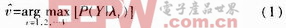 在识别时,对于每个待识别语音,可以得到一个观察矢量序列Y=[y1,y2,…yN],其中,N为输入语音所包含的帧数。语音识别的过程就是计算每个HMM模型λv产生Y的概率P(Y|λv),并使得该概率达到最大的HMM模型,那么该模型所对应的词条即为孤立词识别的结果,即: