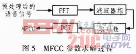首先采用预加重、汉明窗、双门限法等完成对语音信号的预处理;然后使用Mel倒谱参数(MFCC)进行特征识别,MFCC参数提取的过程如图5所示,其中Mel滤波器组的作用是利用人耳听觉特性对语音信号的幅度平方谱进行平滑。对数操作的用途:压缩语音谱的动态范围;考虑乘性噪声,将频域中的乘性成分转换成加性成分。离散余弦变化主要是用来对不同频段的频谱成份进行解相关处理,使得各维向量之间相互独立。