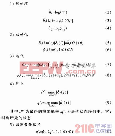 Viterbi算法是一种前向搜索算法,其可以是在给定相应的观察序列时,找出从模型λ中找出的最佳状态序列,即选择输出概率最大的模版作为输出结果。对数形式的Viterbi算法,能够避免大量的乘法运算,减少计算量,同时还可以保证有很高的动态范围,不会出现由于过多的连乘而导致溢出问题,其算法如下: