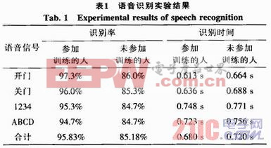 通过以上数据可以看出,该系统的对非特定人(包括参加训练和未参加训练)的简单汉语词汇、数字串、字母串等的综合识别率超过了90%,识别时间在0.7 s左右;具有较高的识别率和较好的实时性。从表中可以看出,未参加训练与参加训练的识别率相差约10%,可以通过在软件中增加训练样本量以及完善有关算法等来进一步提高其识别率。