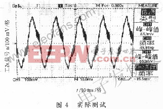 工况信号测试实验。由信号发生器同时产生一个50 Hz低频信号和一个5 kHz高频信号,然后对两个信号进行叠加,作为被测的工况信号。被测的工况信号经过A/D转换、滤波处理、D/A转换,然后在示波器中显示,如图4所示。输出波形中过滤掉了高频信号部分,同时低频信号能够通过该滤波器。由图4中可以看出,滤波处理后与实际信号还存在一定的误差。误差主要是由于算法中采用了低阶滤波器、系数量化误差、器件精度低等原因所致,该误差可以控制在允许范围,还可以通过选择高精度的器件和增加滤波器的阶数得以提高。