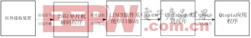 分利用了视频扩展板上的资源。 解码后的数据通过串口送往Sitsang开发板。Qt/Embedded链接库提供对终端设备、虚拟键盘和USB键盘等多种输入设备的支持。为了让Sitsang开发板支持红外遥控器,修改了Qt/Embedded中处理USB键盘事件的部分,将从串口读入的数据作为键盘事件来处理,结合应用程序中热键的定义,完成了遥控功能。 图4 红外遥控部分的基本结构 网络服务 有了媒体播放器的支持,用户基于宽带网络既可以利用FTP下载工具,从FTP站点上下载影音资源,又可以通过VOD点播系统实现在线观看视频节目,享受丰富的网络资源。本系统支持基于HTTP协议的顺序流式VOD点播和网络文件系统NFS的视频点播。除提供VOD点播服务外,本部分还提供网络广播的收听和网络文件系统的功能。 结语 本系统通过移植MPlayer播放器,扩大Sitsang平台的功能,支持MPEG-1、MPEG-2、DivX3、DivX4、DivX5、XviD等视频格式和MP3、WMA等音频格式文件的流畅播放。同时还支持HTTP协议的网络文件的播放和网络广播的收听。 视频扩展板的输出信号稳定,色彩自然。配合宽屏幕的彩色电视机,给人以美好的视觉享受。视、音频信号录制功能可以实现录像机、网络机顶盒等功能,与LCD配合又可以使得“随身看”的节目源多样化。红外遥控功能操作简单,能在相当大的范围内保证正确的识别。 系统中提供的其它模块涉及到图像处理、文件管理、网络下载、移动存储等软硬件技术,在测试中各模块工作正常,性能稳定,达到了设计的指标。 参考文献: 1. 陈章龙等,嵌入式技术与系统——Inter XScale结构与开发,北京:北京航空航天大学出版社,2004 2. Arthur Griffith,KDE 2/Qt编程宝典,北京:电子工业出版社,2002
