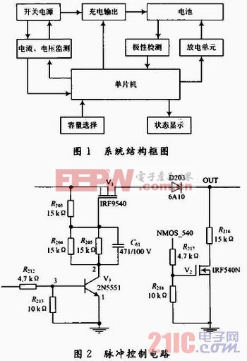图2为脉冲控制电路。单片机通过控制V3来控制PMOS管V1的通断,即可控制充电器的输出;通过瞬时打开V2给蓄电池短暂放电,提高蓄电池接受电流的能力。C61起到加快MOS管关断速度的作用。
