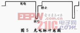 充电器判断充电状态主要根据充电电流控制充电器输出,电流小于50 mA后关闭IRF9540。充电次数记忆在单片机的E2PROM中,满20次后调用脉冲充电程序对电池进行修复充电。图5为充电脉冲示意图。充电20~200 ms后关闭充电主回路的PMOS管,打开放电回路的NMOS管,延时10~20μs,然后关闭放电回路,延时20~50μs后重新打开充电主回路进行充电,完成一个充放电(正负脉冲)周期,即充→放→停→充。另外不同的阶段还可采取充→停→充的称之为慢脉冲的充电模式。