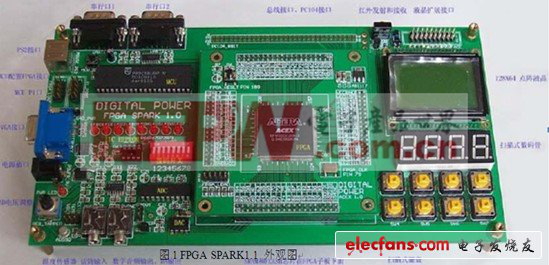 为了更直观的理解,我们需要一个实验平台,在本文中,采用的是 Digital Power Studio 工作组 FPGA SPARK1.1 综合开发平台的 Xilinx 标准型开发系统。如图 1 所示(图中为 Altera 子板,只需改成 Xilinx 的即可)。在该开发系统中,所采用的芯片是SPARTANII系列的XC2S200 。