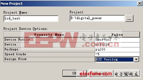 在 Project Name 栏输入项目名称,Project 中填入该项目的目录,Project Device Options 中,Device Family 为所用芯片所在系列,Device 为所用芯片,Package为所用芯片的封装形式(每个芯片可能有不同封装的几种,如 XC2S200 有 3 种封装的),Speed Grade 为速度等级,Design Flow 为所选用综合方式(综合工具