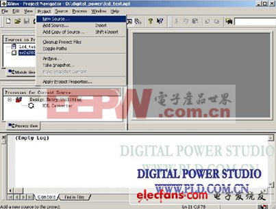 如图 7 中所示,在 Project 菜单下,选择 New Source 建立新的代码文件。弹出的对话框如图 8 所示。