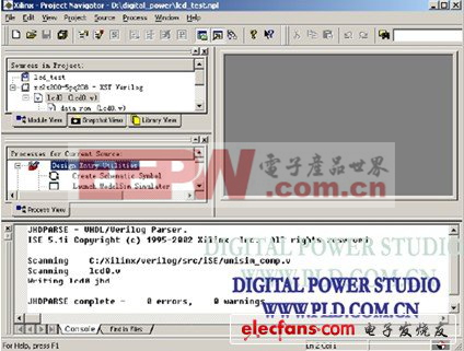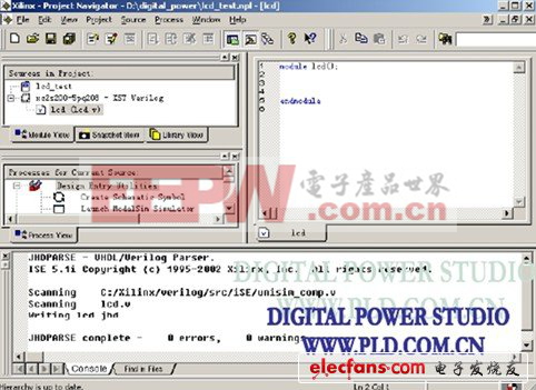 在图 7 中不要选择 New Source,而选择 Add Source。在弹出的窗口中找到已有代码文件(可同时加多个文件),并点击“打开”即可。注意:Add Source 是将当前选择的代码加入到当前 project 中,而 Add Copy of Source 是将代码文件复制到当前 project 所在目录中,并将复制后的文件加到 project 中。建议使用后者。添加后结果如图 11 所示。(在本文例子中,加入的是 Digital Power 提供的液晶程序 lcd.v。)可以看到在Module View 窗口中将显示出 verilog 代码中所有Module,并显示出其层次结构以及其所在的文件。