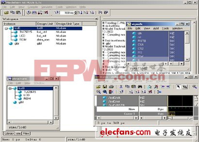 图13 调用 Modsim图13 中Module View 窗口中选中代码的最顶层模块。而后如图 13 蓝色部位所示,在 Process View 窗口中的 Launch Modelsim Simlator,将自动打开 Modsim,并且已将当前 project 的相关信息加载到了 Modsim 中。如图 14 所示。要注意的是,后仿真也是如此调用 Modsim。关于 Modsim 的使用请参考相关文档。如果需要仿真的不是最顶层模块,则在 Module View 窗口中选中相应的代码文件,用同样的步骤调用仿真。