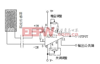 从温度传感器送来的信号进入放大器,放大器采用AD521 集成测量放大器,这种放大器具有高输入阻抗,低失调电流,高共模抑制比的特点,其增益可