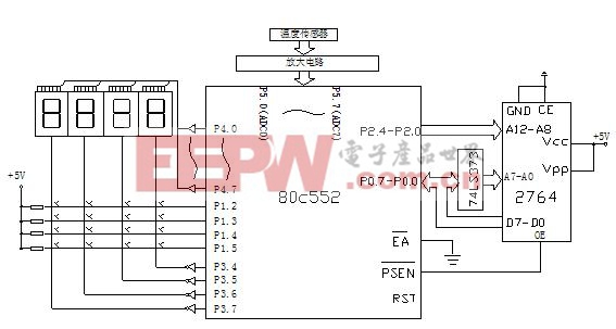 系统的硬件部分主要由前端输入电路、人机界面电路、CPU及外围电路组成。所需要的元器件有:CPU采用PHILIPS 80C552、EPROM为2764、传感器采用PT温度传感器(精度等级为0.5级,测量范围-80℃--+180℃)、AD521测量放大器、4片数码管、4x4键盘。