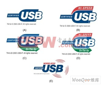 为了确保大量的终端用户的USB体验,USB论坛(USB-IF)维持一个资质授予许可程序。为了获得资质徽标的使用权,设备厂商必须通过USB-IF的认证,包括规范兼容性和互通性测试。对于标准的USB设备有两个徽标:图2a给出的是支持低速和全速的设备标志;而图2b则是用于支持最高数据率的高速设备标志。