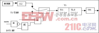 GATE=1,在此种情况下,计数脉冲通路上的开关不仅要由TR1来控制,而且还要受到INT1管脚的控制,只有TR1为1,且INT1管脚也是高电平,开关才合上,计数脉冲才得以通过。这个特性能用来测量一个信号的高电平的宽度,想想看,怎么测?