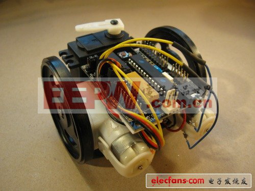 如果你愿意的话,你也可以把它弄得更漂亮。需要强调的是我们使用两个主轮,每个用一个马达驱动。控制它们前进机器人就会前进;控制一前一后,则会原地打转;如果一个动,一个不动,就好像向一边滑动的感觉。