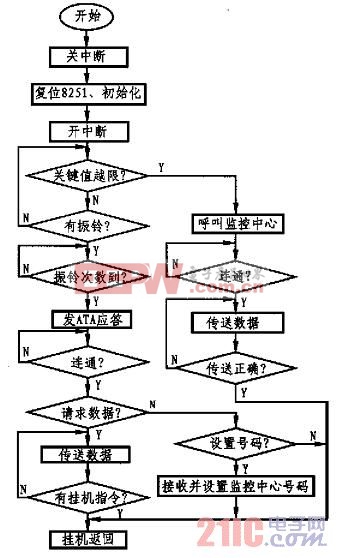 现场数据采集器有两种工作方式, 即主叫方式和被叫应答方式。主叫方式就是现场数据采集器主动呼叫监控中心;被叫应答方式是在现场数据采集器收到监控中心的呼叫振铃后响应应答指令。另外,现场数据 采集器具有远程设置主叫呼叫号码的功能,其软件编制流程图如图3 所示。